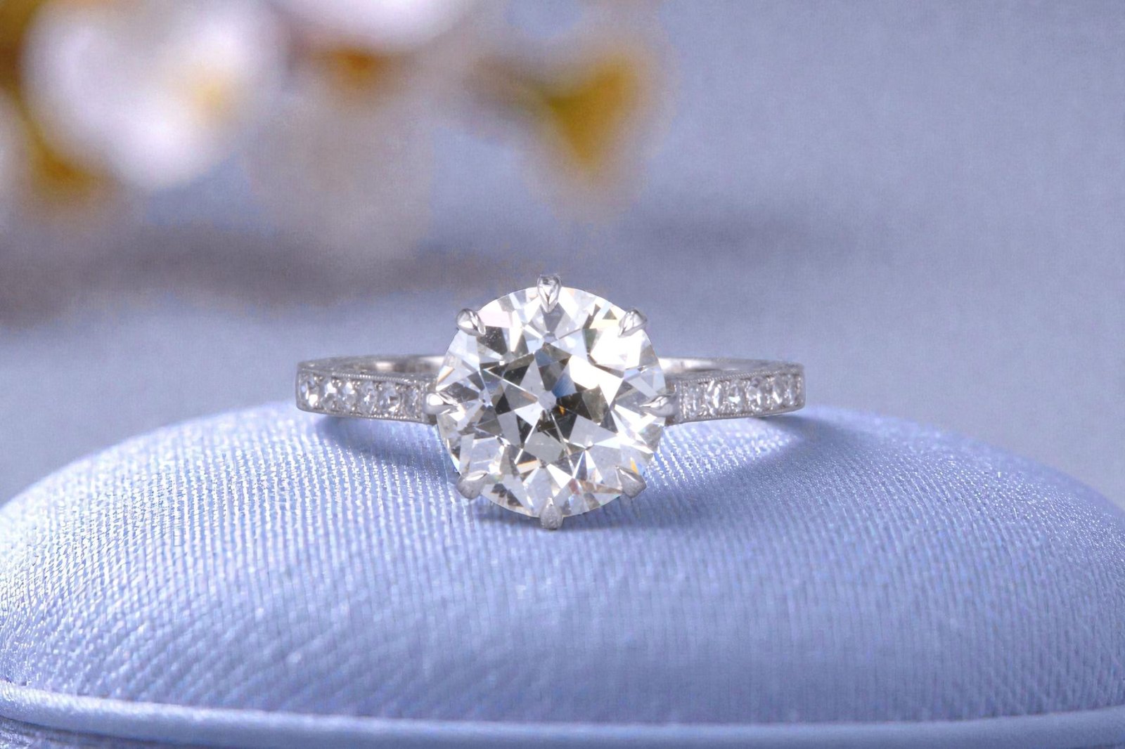 Framed in platinum, the center diamond radiates a soft, romantic brilliance that defines the ring’s early 20th-century character while maintaining impressive presence.