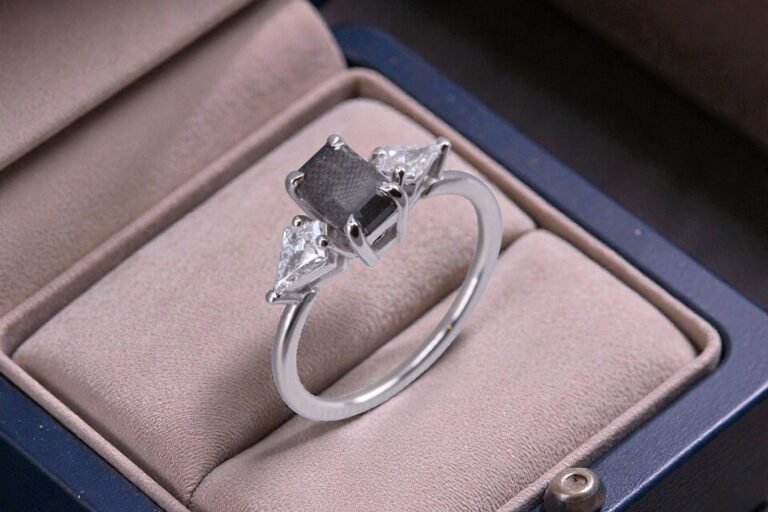 Seen from above, the ring’s clean lines and graphic balance come into full view. The emerald-cut gray diamond anchors the design with a confident, design-forward mood, while the kite-shaped side stones add an unexpected Art Deco-inspired edge.