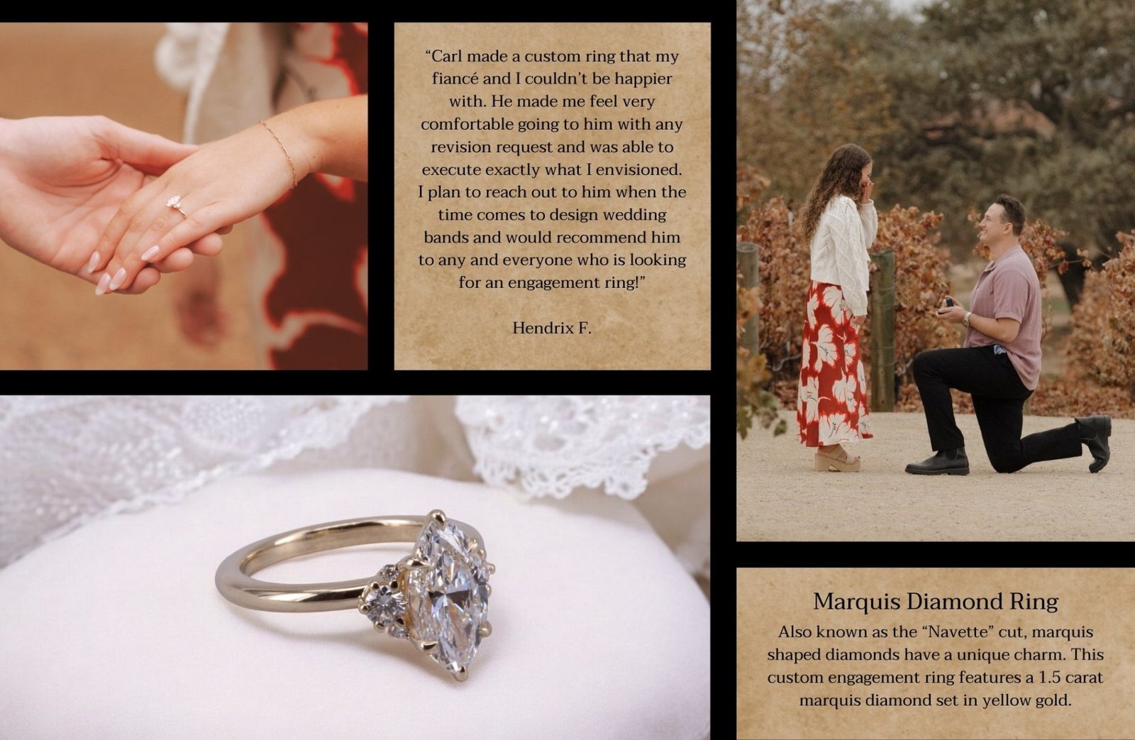 This custom 1.50-carat marquise diamond engagement ring from C. Blackburn Jewelers showcases the dramatic symmetry that makes the marquise cut so captivating.