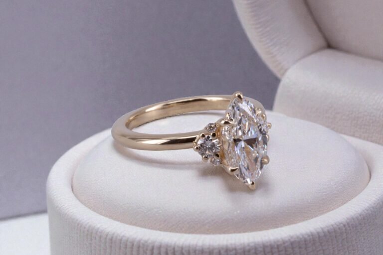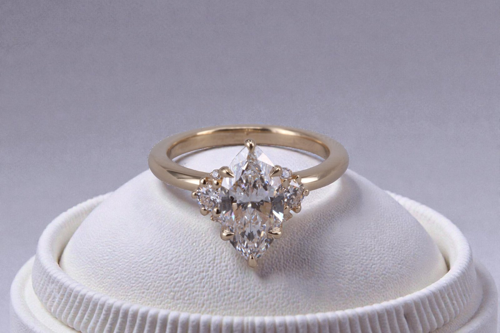 Viewed from the side, the ring reveals the graceful lift of the 1.50-carat marquise diamond and the careful craftsmanship behind its setting.