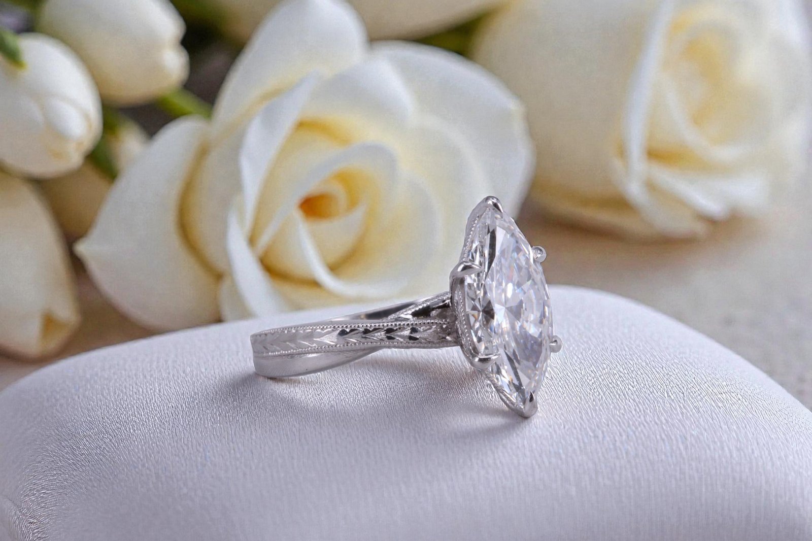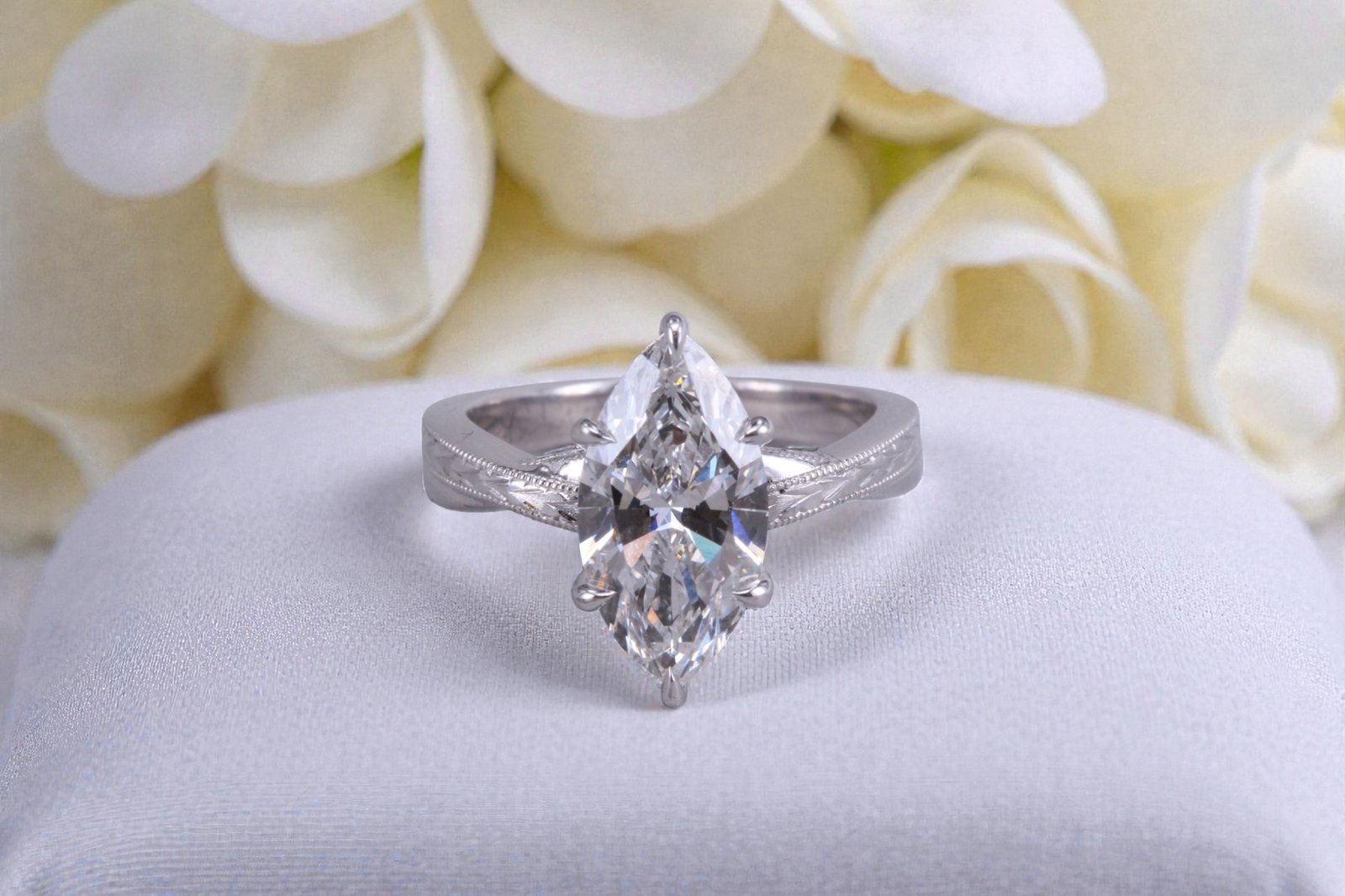 Seen head-on, the marquise diamond’s elongated silhouette creates a dramatic yet graceful presence.