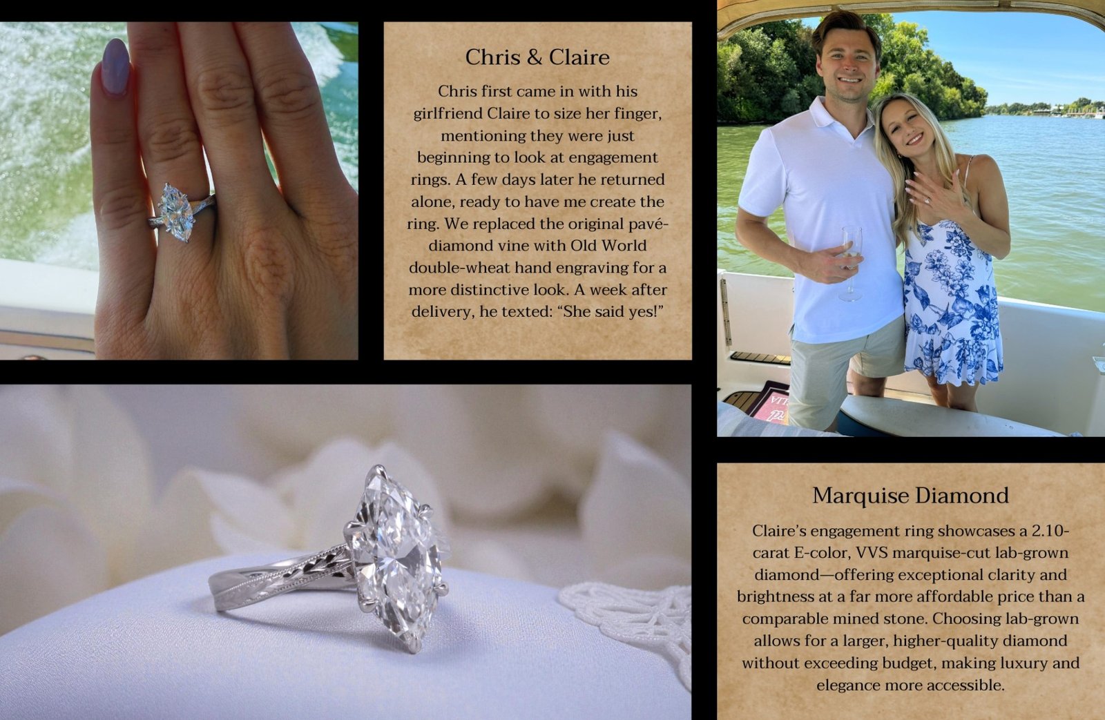 This custom engagement ring by Carl Blackburn is centered around a striking 2.10 carat marquise diamond, lab-grown and graded E color with exceptional VVS clarity.